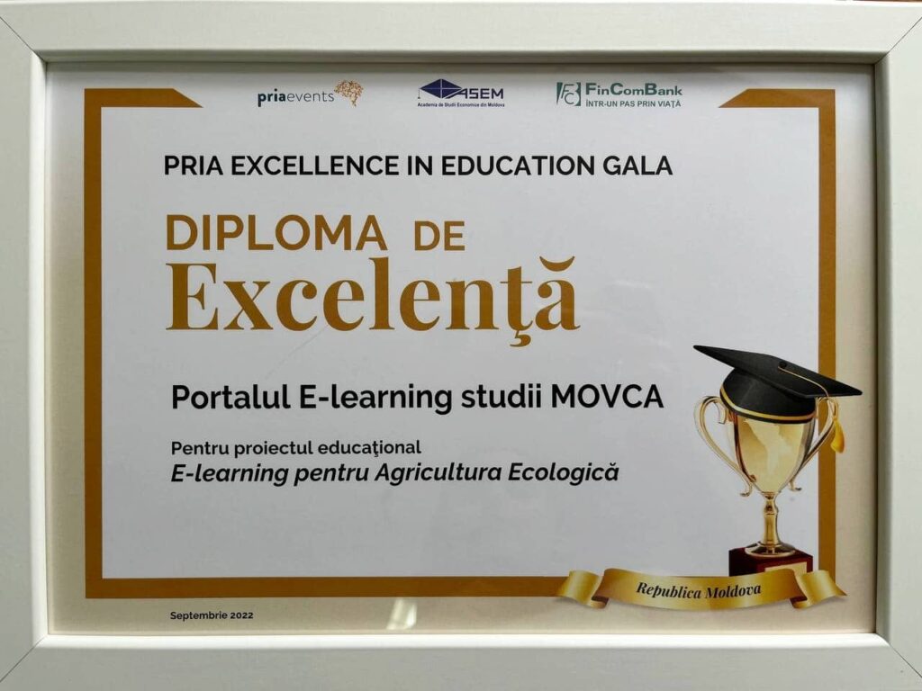 Platforma de instruire online în principiile agriculturii ecologice www.studii.movca.md a fost creată de Asociația MOVCA în cadrul proiectului „Portalul educațional e-learning în agricultura ecologică”.